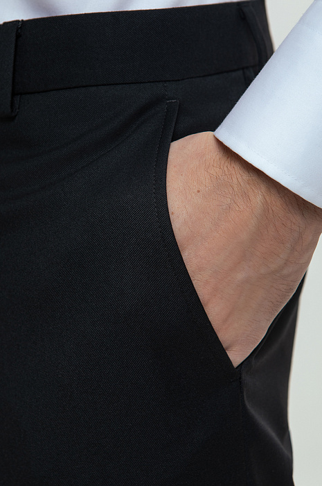 Классические черные брюки под смокинг со стрелками – ключевой элемент образа для особых случаев, будь то корпоративный вечер, торжественный прием, премьера в театре или свадьба. Дизайнеры KANZLER позаботились о том, чтобы в брюках было комфортно даже во время длительных мероприятий. Мягкий и прочный смесовый материал приятно ощущается на коже и сохраняет первоначальную форму в течение долгого времени. Подкладка из полиэстера и хлопка обеспечивает комфорт во время длительного ношения и поддерживает оптимальный воздухообмен. Приталенный крой подчеркивает достоинства фигуры, а классические стрелки визуально вытягивают силуэт. Предлагаем сочетать модель с пиджаком-смокингом из того же материала, белой рубашкой, галстуком-бабочкой и классическими кожаными туфлями. Параметры модели: рост 192, 101-76-97 Размер на модели: 50