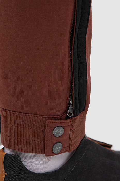 Коллекция спортивной одежды в новой интерпретации от дизайнеров KANZLER. Представляем трикотажные брюки в терракотовом оттенке. Практичный, но благородный оттенок в тренде в текущем сезоне. Дизайнеры уделили особое внимание комфорту и продуманным деталям: расслабленная посадка на кулиске, контрастные лампасы и простроченные стрелки, которые создают дополнительные вертикальные линии, широкие манжеты, застегивающиеся на молнию и брендированные кнопки. Модель с двумя боковыми карманами дополнили функциональным карманом сзади. Для пошива использовали мягкий, дышащий хлопковый трикотаж с добавлением прочных волокон полиэстера и эластана для лучшей износостойкости и посадки по фигуре. Толстовка на молнии и белая футболка гармонично дополнит образ с зауженными брюками. Параметры модели: рост 191, 97-77-99 Размер на модели: M