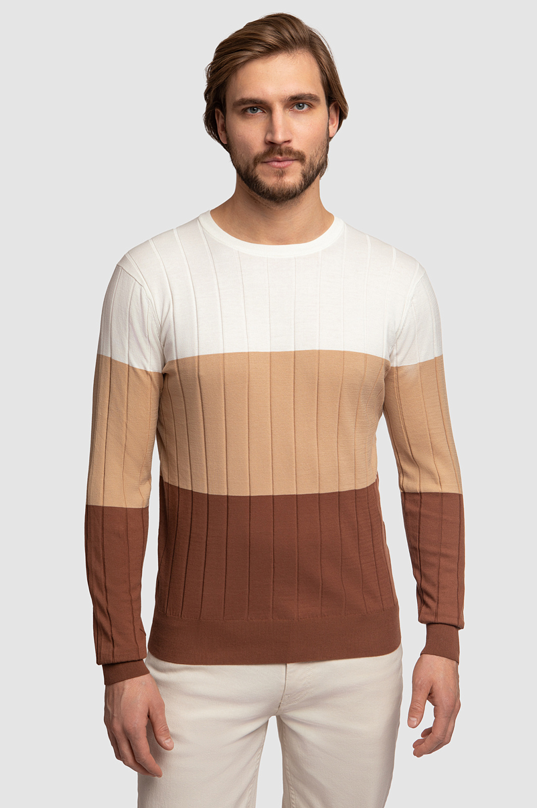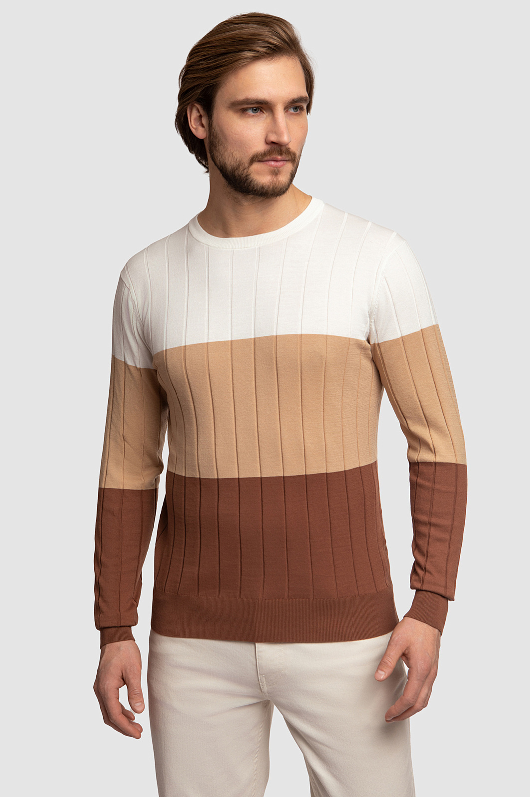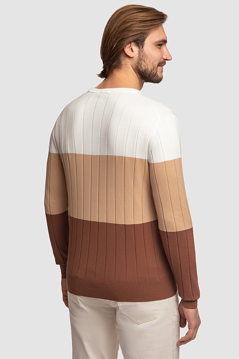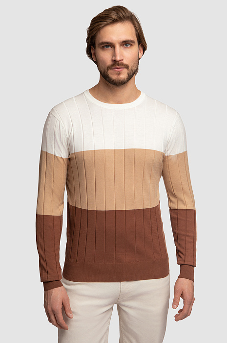 Джемпер KANZLER прямого кроя получился легким и приятным на ощупь, поэтому его комфортно носить в течение всего дня. Дизайн модели основан на принципе комбинирования цветовых блоков в одном изделии. Джемпер в широкую горизонтальную полоску — отличный вариант освежить и разнообразить повседневный и праздничный гардероб. Достаточно подобрать низ в молочных или коричневых оттенках, чтобы завершить образ. Модель c круглым воротом связали из мягкого хлопка Пима, который относится к премиальному сорту хлопка. Он обеспечивает эффектный внешний вид, невероятную мягкость, тонкость и воздушность фактуры. Гипоаллергенный материал прекрасно поддерживает оптимальную температуру и хорошо пропускает воздух. Параметры модели: рост 187, 100-81-97 Размер на модели: M
