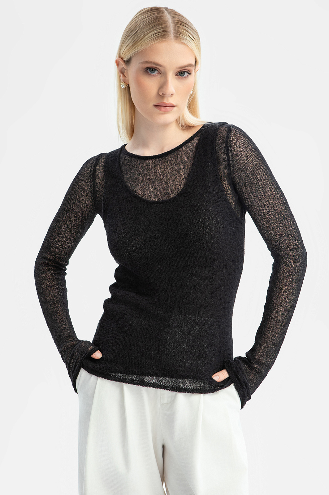 Черный джемпер KANZLER — стильная женственная модель, состоящая из полупрозрачного лонгслива и плотного топа. Облегающий трикотаж окутывает тело дымкой, подчеркивая изящество фигуры и грациозность свободных, ничем не скованных движений. Удлиненные рукава можно собирать на запястьях или расправлять на полную длину, до кончиков пальцев. Мягкий смесовой трикотаж из хлопка и нейлона обладает достоинствами натуральных и современных технологичных волокон. Гипоаллергенный хлопок обеспечивает оптимальную температуру для тела. Нейлон придает трикотажу прочность и эластичность. Ткань отлично дышит и со временем не теряет форму. Параметры модели: рост 175, 88-65-92 Размер на модели: S