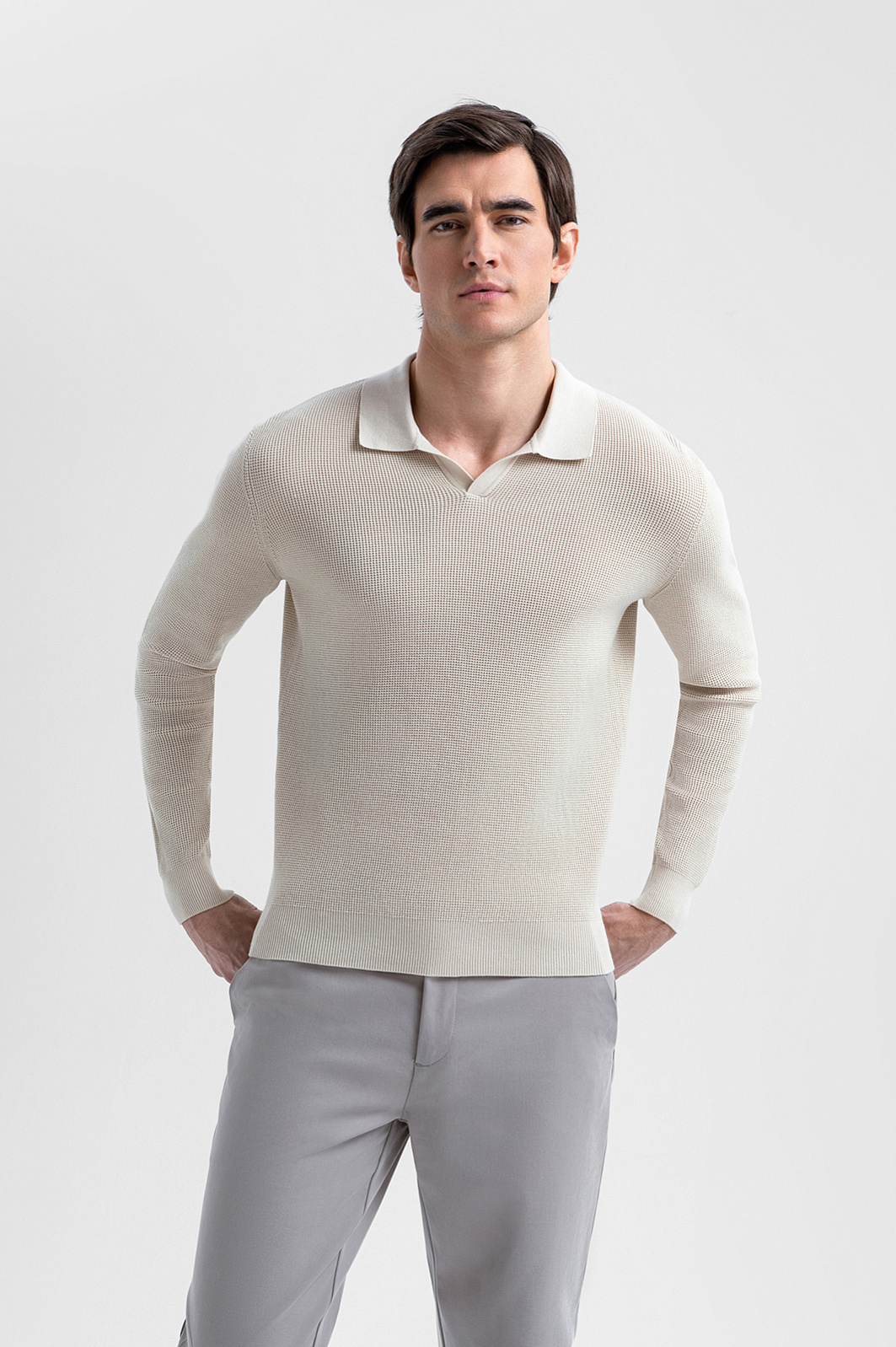Поло KANZLER с длинным рукавом выполнено из 100% хлопка. Его светло-бежевый оттенок создаёт ощущение лёгкости и подходит для городских и более расслабленных курортных образов. Неглубокий треугольный вырез горловины добавляет модели динамичный спортивный характер. Длинный рукав делает поло комфортным выбором для межсезонья и прохладных дней. Мягкие трикотажные резинки на рукавах и по низу надёжно фиксируют края и обеспечивают аккуратную посадку. Полотно с лёгкой фактурой создано из чистого хлопка. Натуральные гипоаллергенные волокна поддерживают комфортную температуру и ощущение свежести в течение всего дня.