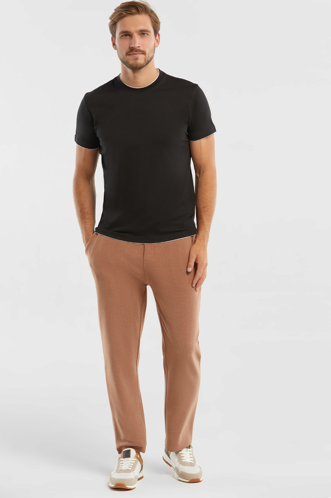 Мягкий материал, лаконичный фасон и не сковывающий движения крой — основные требования, которые мы предъявляем к повседневной одежде. Черная футболка с круглым вырезом полностью им соответствует. Для пошива изделия использован гладкий натуральный хлопок, который немного тянется и комфортно садится по фигуре. В качестве стильного акцента дизайнеры использовали двойную декоративную отделку воротника, рукавов и низа изделия. Футболка KANZLER будет одинаково хорошо смотреться в любых образах вашего повседневного гардероба. Параметры модели: рост 187, 100-81-97 Размер на модели: M