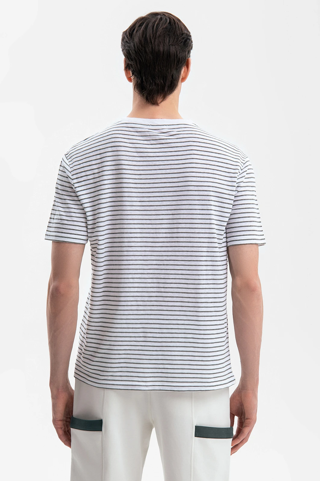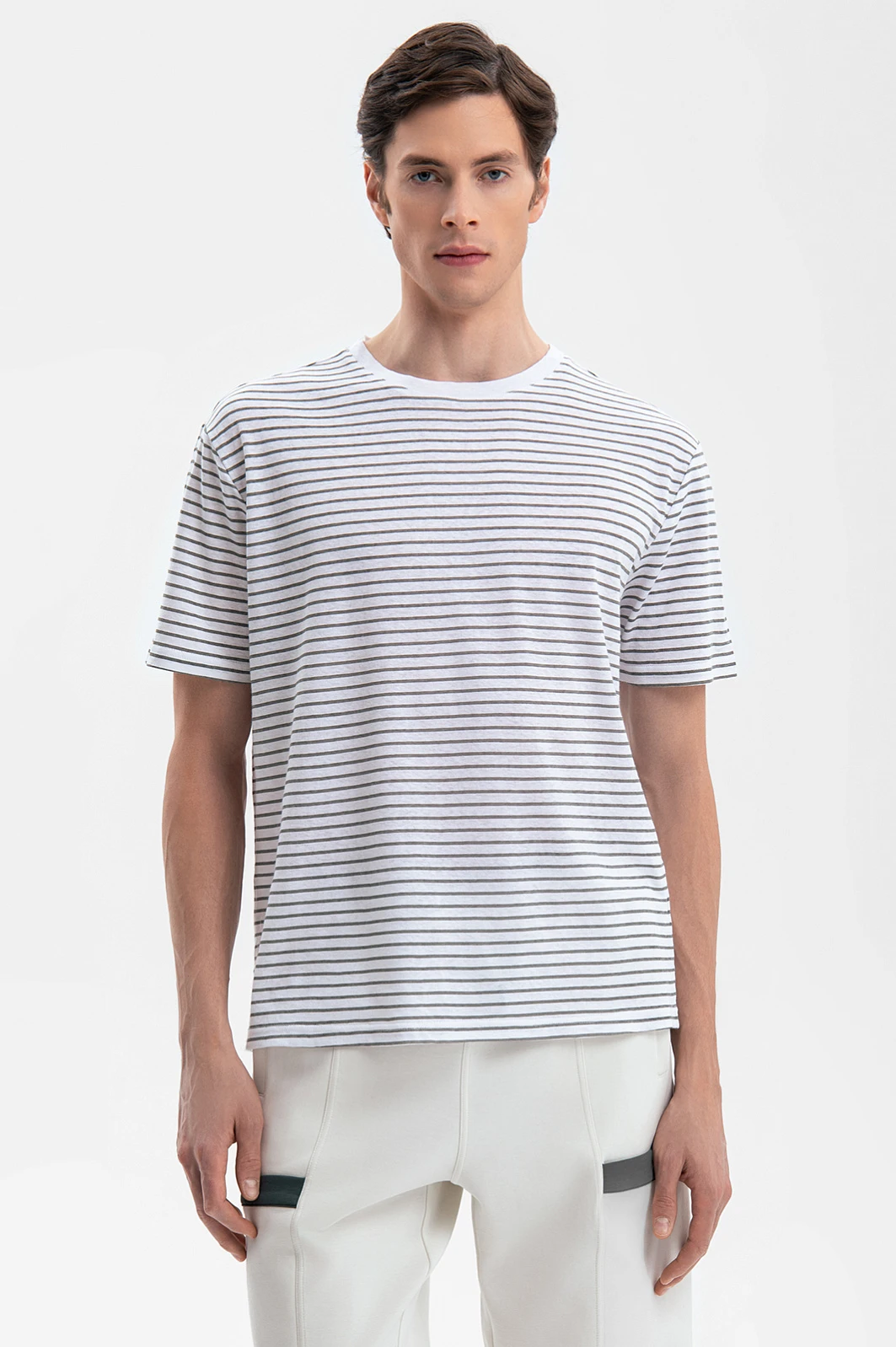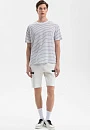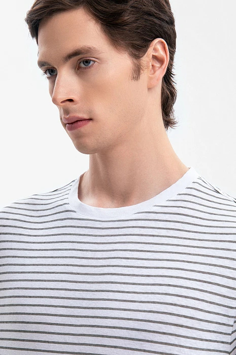 Футболка KANZLER в полоску – формула вашего комфорта. Свободный крой, экологичный долговечный материал и универсальный фасон – модель будет радовать своим качеством на протяжении многих сезонов. Для ее создания выбрали материал, объединивший лучшие свойства льна и хлопка: мягкая ткань отлично сохраняет форму, не растягиваясь, и сохраняет комфорт в жаркий день – гигроскопичная ткань быстро впитывает влагу и дарит ощущение прохлады. Свободный крой обеспечивает абсолютную свободу движения. Сочетайте футболку с оливковыми бермудами и эспадрильями или дополните темно-синими джинсами и кедами для городского образа. Параметры модели: рост 189, 91-78-95 Размер на модели: М