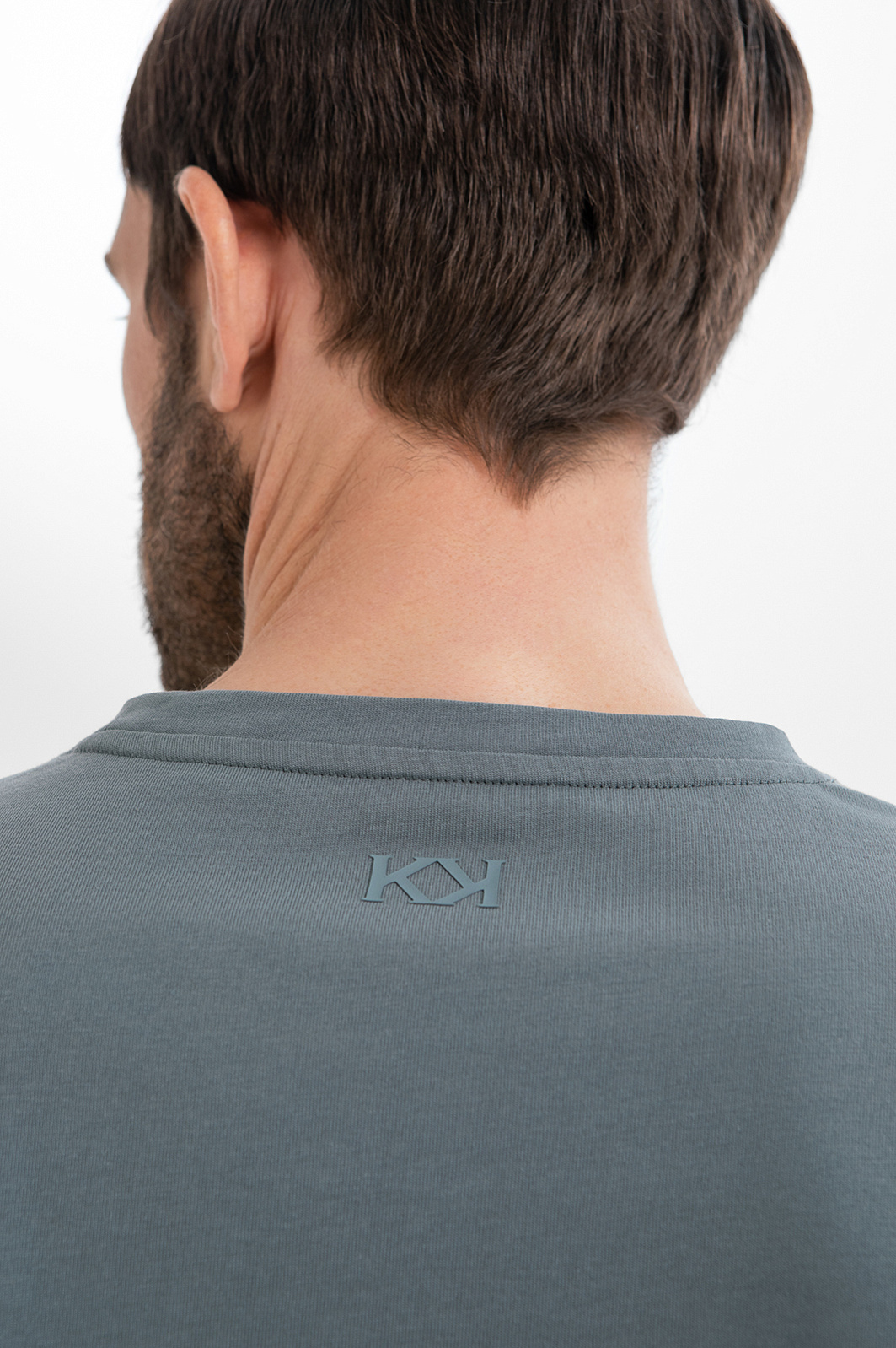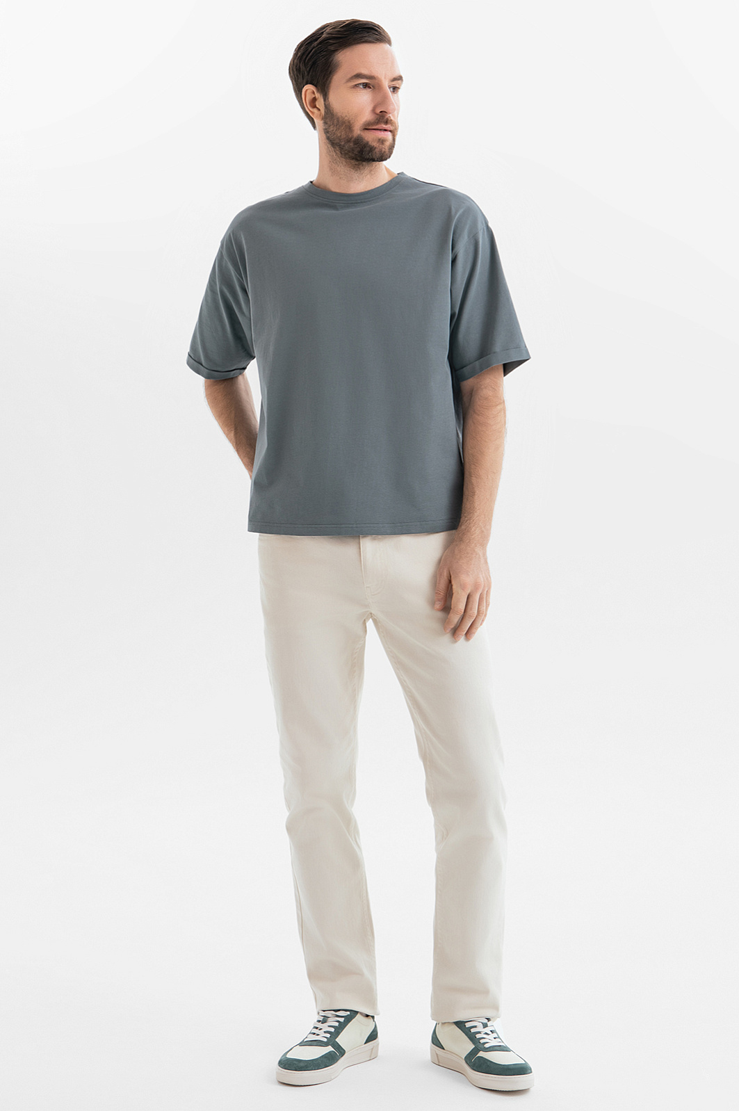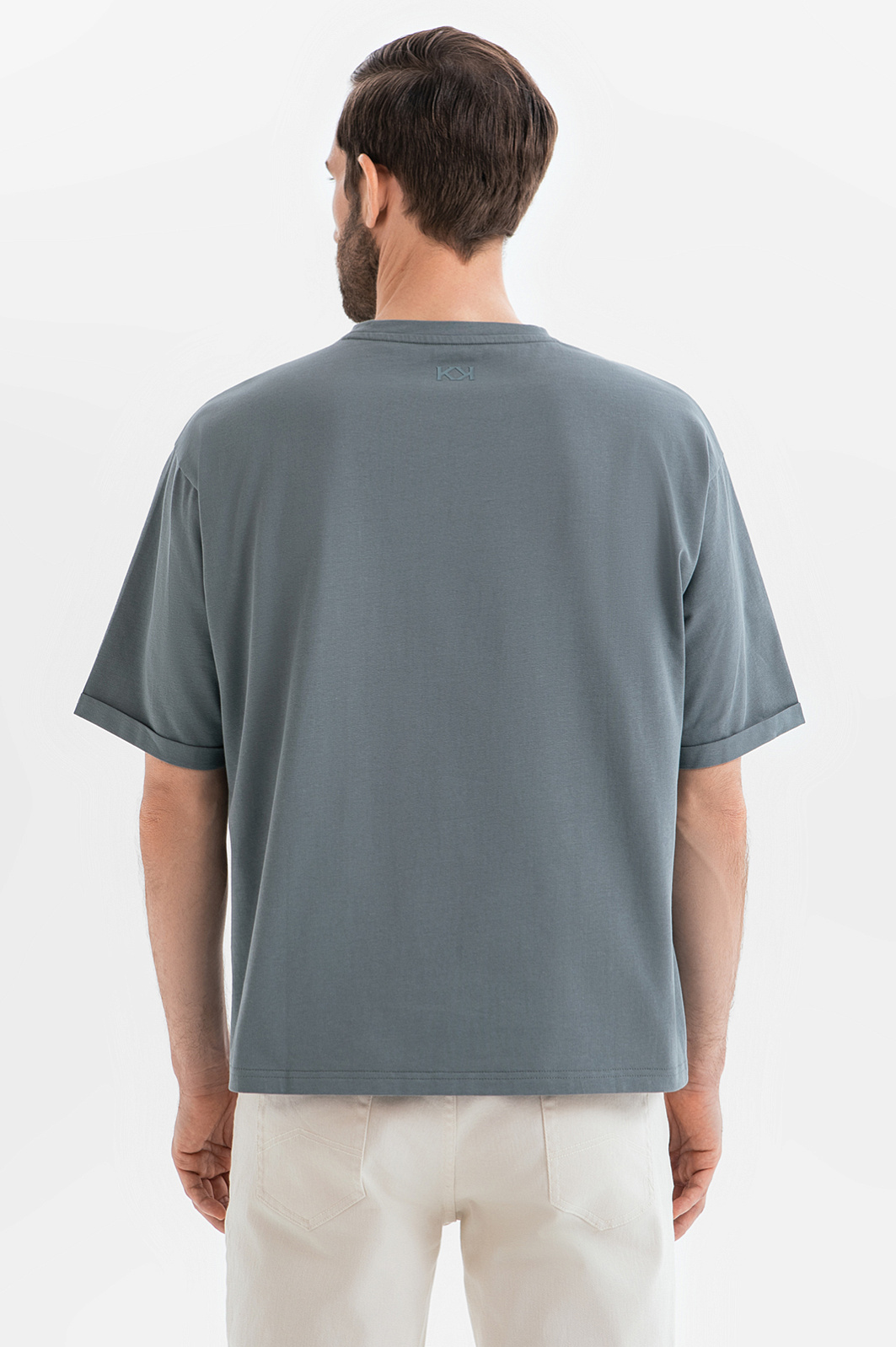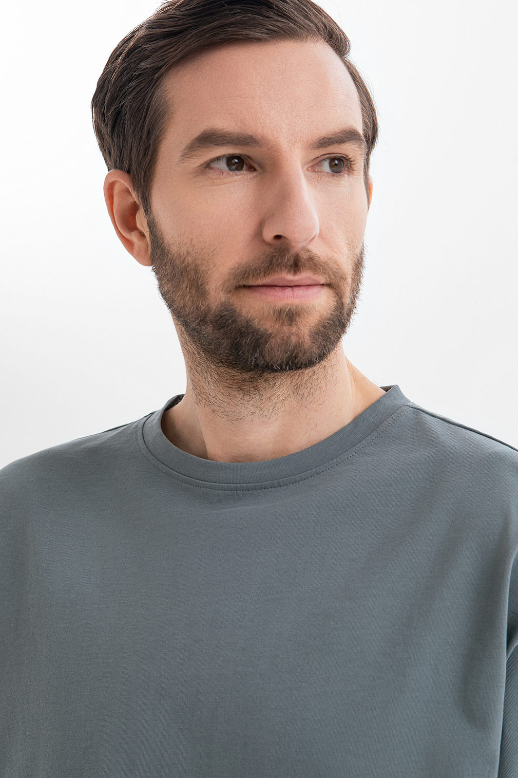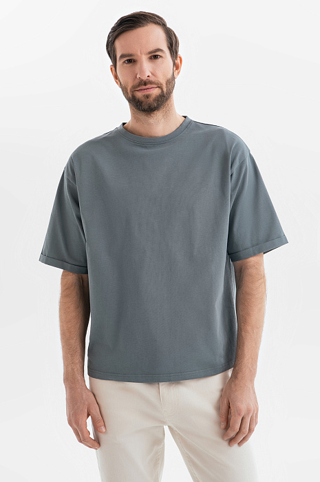 Серо-зеленая футболка KANZLER - воплощение абсолютного комфорта в каждой детали. 100-процентный хлопок нежно соприкасается с кожей, обеспечивает превосходные дышащие свойства и не вызывает раздражения. Материал с гладкой матовой фактурой отлично держит форму в течение дня и сохраняет первоначальный цвет после многократных стирок. Крой оверсайз подходит любому типу фигуры, дарит свободу движения и широкие возможности для стилизации. Параметры модели: рост 187, 99-81-97 Размер на модели: M