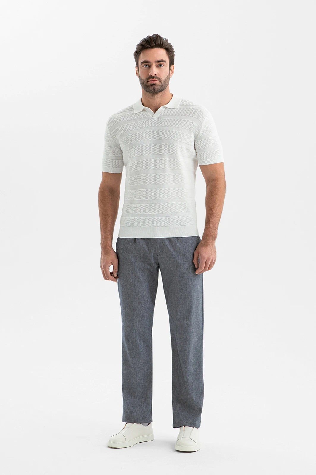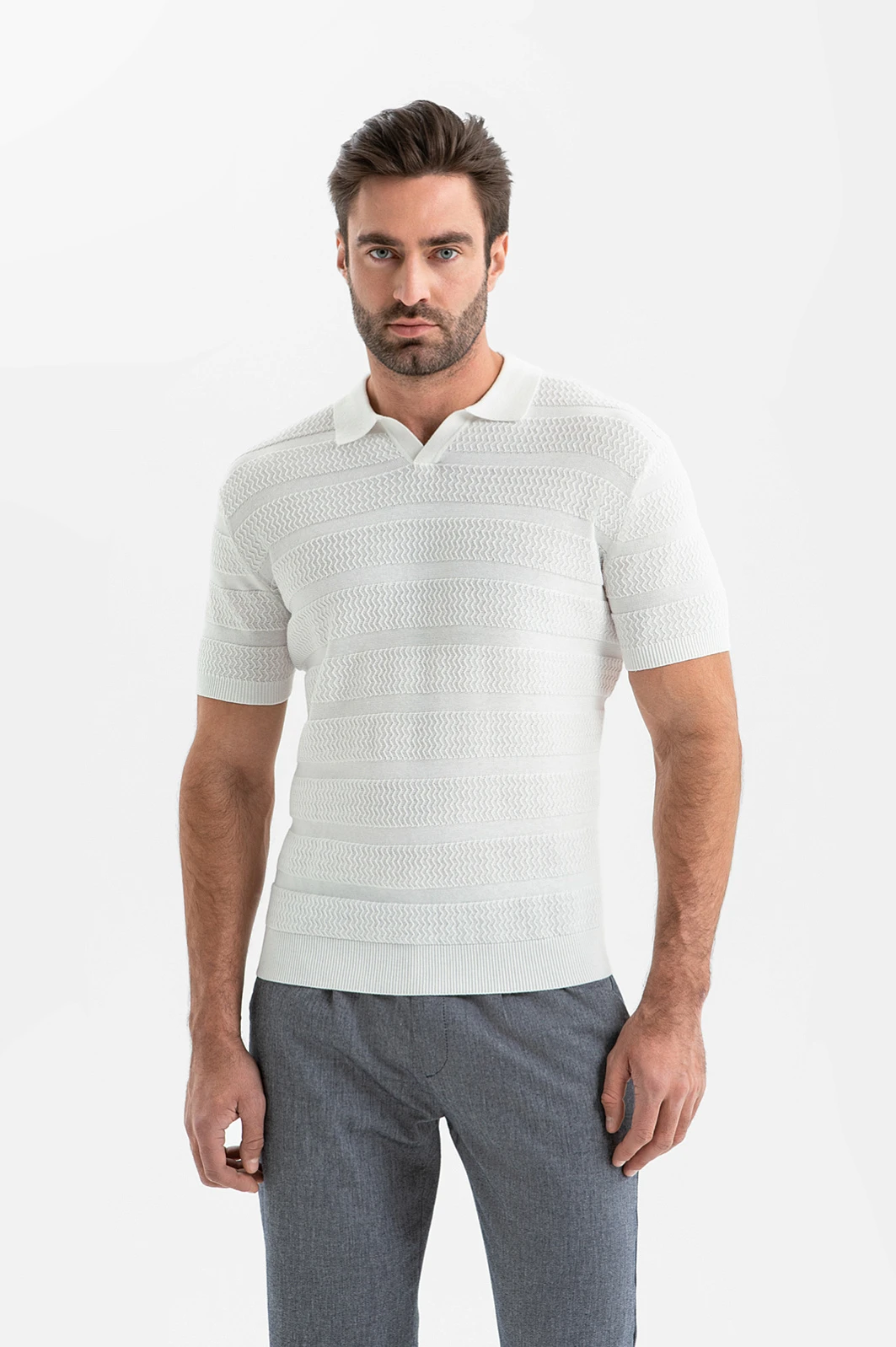 Белоснежное поло KANZLER из рами и хлопка превращает прозу дня в праздник и наполняет повседневный образ солнечным настроением и лёгкостью. Притягательная фактура задана выразительным узорным плетением и рельефными полосами. Ребристые трикотажные резинки на рукавах и по низу надёжно придерживают края, сохраняя аккуратную посадку. В составе натурального смесового материала — рами и хлопок. Нити, производимые из стеблей китайской крапивы, укрепляют полотно и делают его структурным, а волокна хлопка обеспечивают мягкость и воздухопроницаемость ткани.