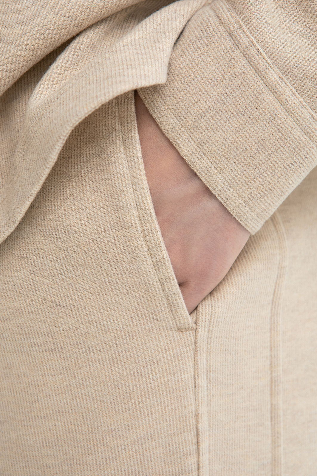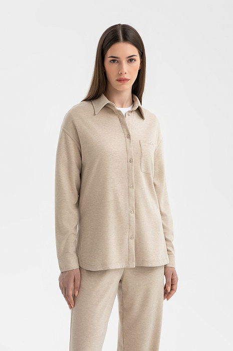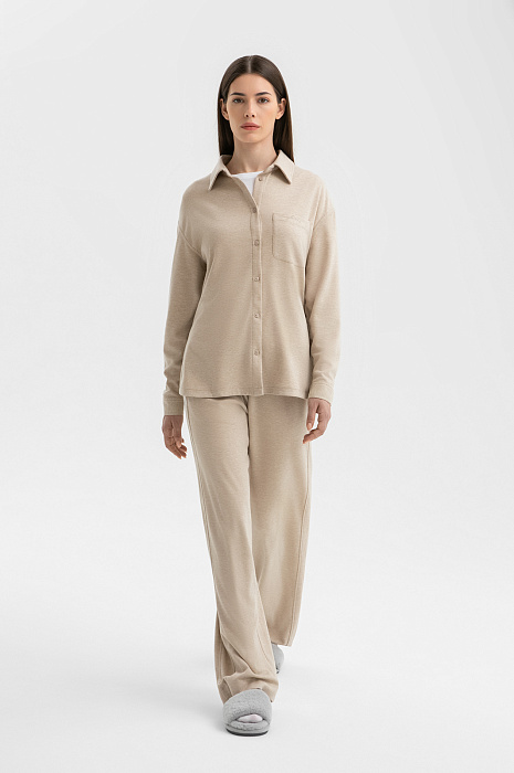 Пижамный комплект KANZLER приятного песочного оттенка предназначен для безмятежного отдыха и приятных домашних ритуалов — неизменной утренней чашки кофе, просмотра нового сериала или чтения. Костюм состоит из сорочки просторного кроя и слегка расширяющихся к низу брюк с лампасами. Смесовая ткань в мелкий рубчик мягко облегает тело, не стесняя движений. Материал сделан из технологичных волокон с добавлением натуральной шерсти. Полиэстер и акрил обеспечивают прочность и устойчивость к деформации, вискоза — воздухопроницаемость, полиамид — эластичность, а шерсть сохраняет естественное тепло.