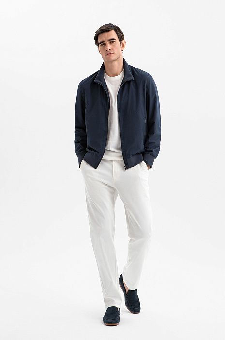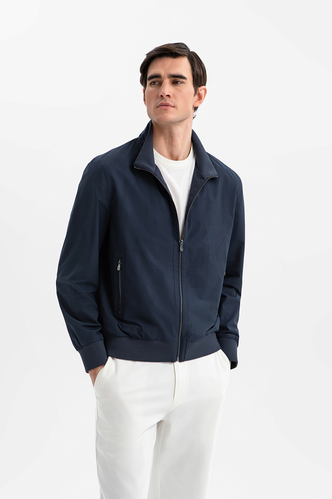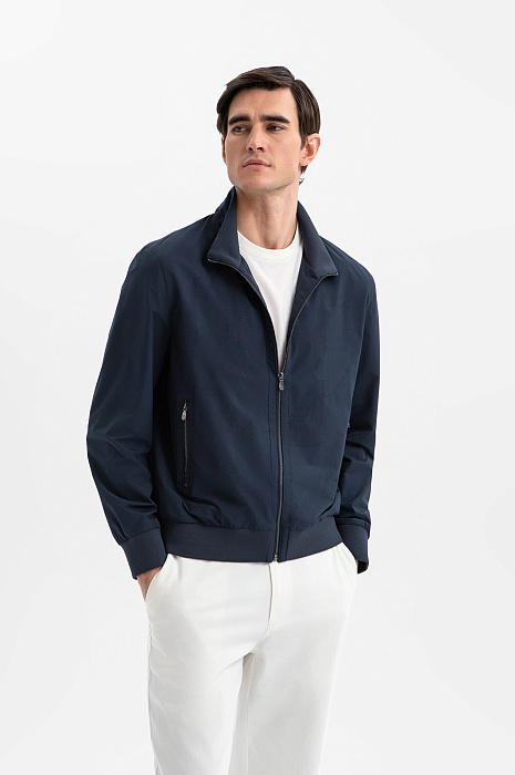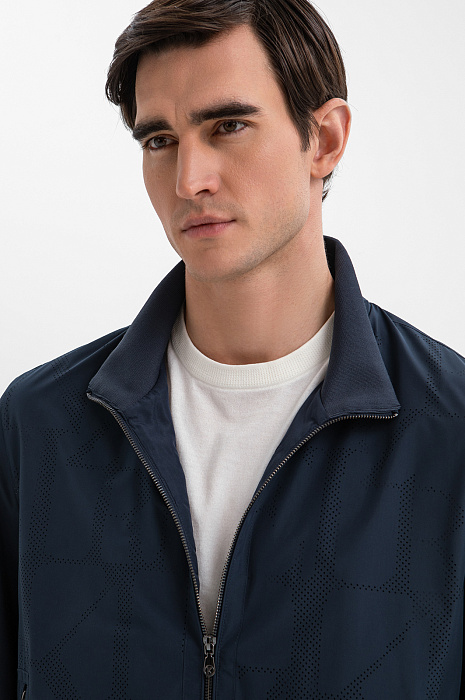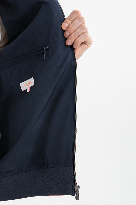 Стильный бомбер KANZLER глубокого синего цвета на молнии — технологичная интерпретация спортивной классики, вдохновлённая и эстетикой мегаполиса. Утром в нём приятно выйти за порцией кофе, а вечером — отправиться гулять по центру, ощущая сердцебиение большого города. Передняя часть украшена тонкой точечной перфорацией в виде фирменной буквенной графики. Центральная застёжка и врезные вертикальные карманы на молнии придают модели динамику. Широкие трикотажные резинки на рукавах и по низу обеспечивают плотное прилегание краёв и аккуратную посадку. Верх из полиэстера — надёжный барьер от ветра. Это прочный износоустойчивый материал, который отлично сохраняет форму и первозданный вид.