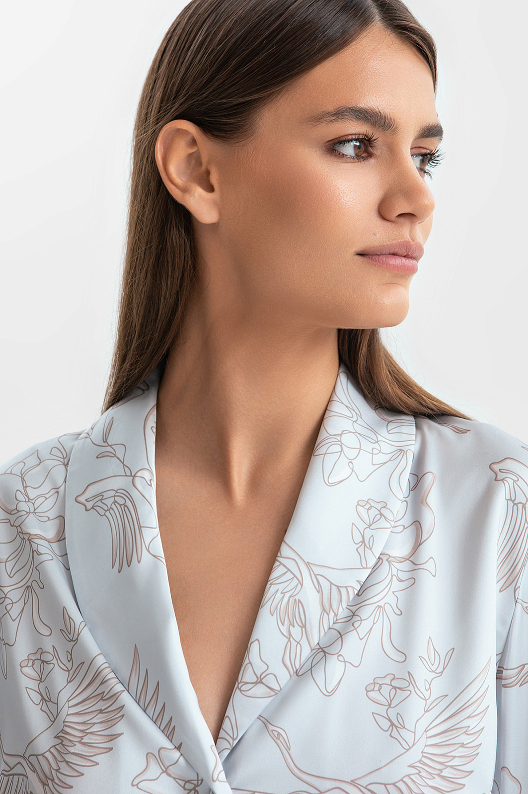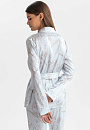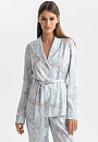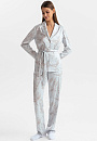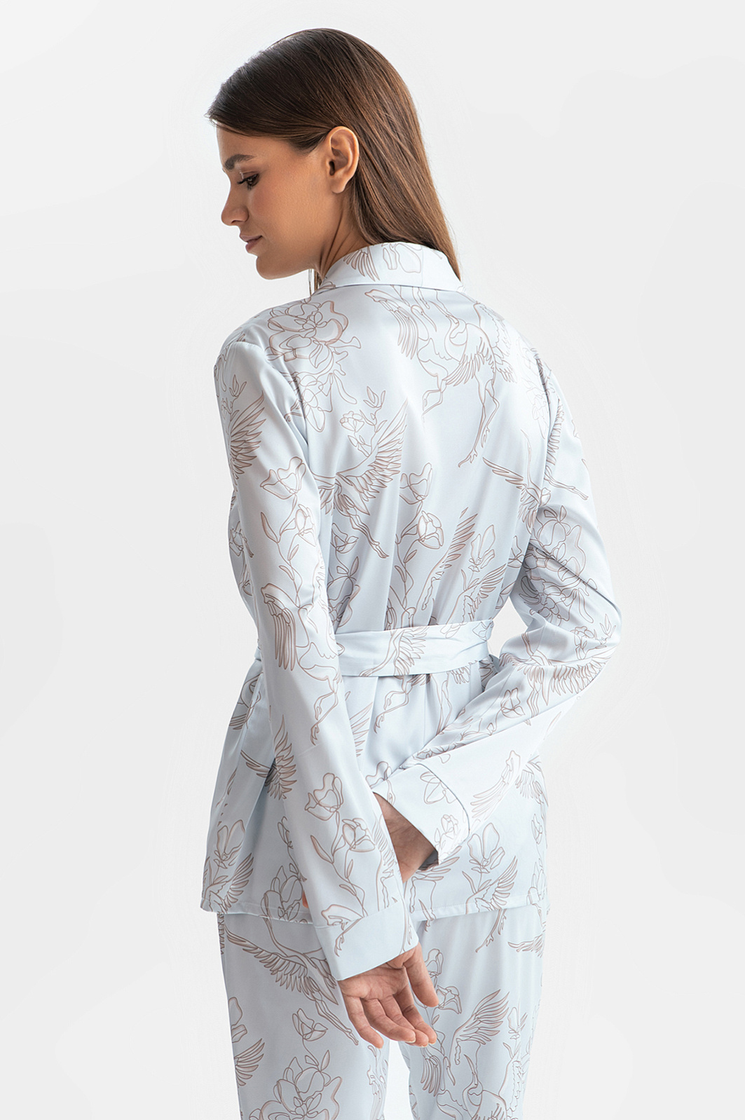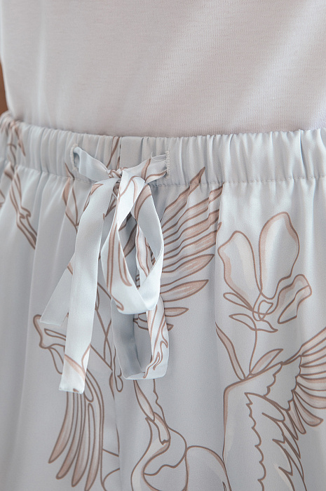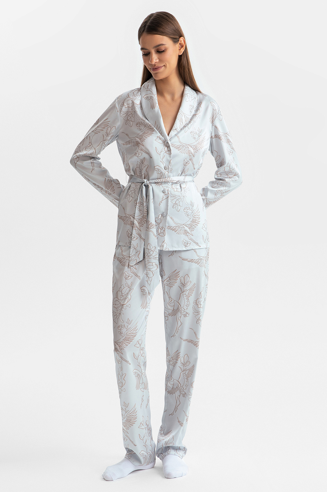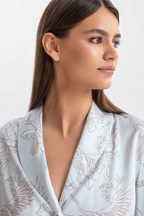 Пижама в мягком светло-сером оттенке, который идеально подходит любому цветотипу, освежает образ и создаёт атмосферу спокойствия. Верх пижамы — удобная рубашка со свободным поясом, который красиво выделяет линию талии. Низ — брюки с практичной кулиской на поясе. Ткань премиального качества отличается необыкновенной мягкостью, нежно окутывает кожу, даря ощущение свежести и уюта. Узор с журавлями, символизирующий душевное спокойствие и внутреннюю свободу, добавляет экзотический штрих, превращая повседневную пижаму в произведение искусства. Это идеальный вариант для неспешного утра с чашкой любимого кофе или расслабленного вечера дома.