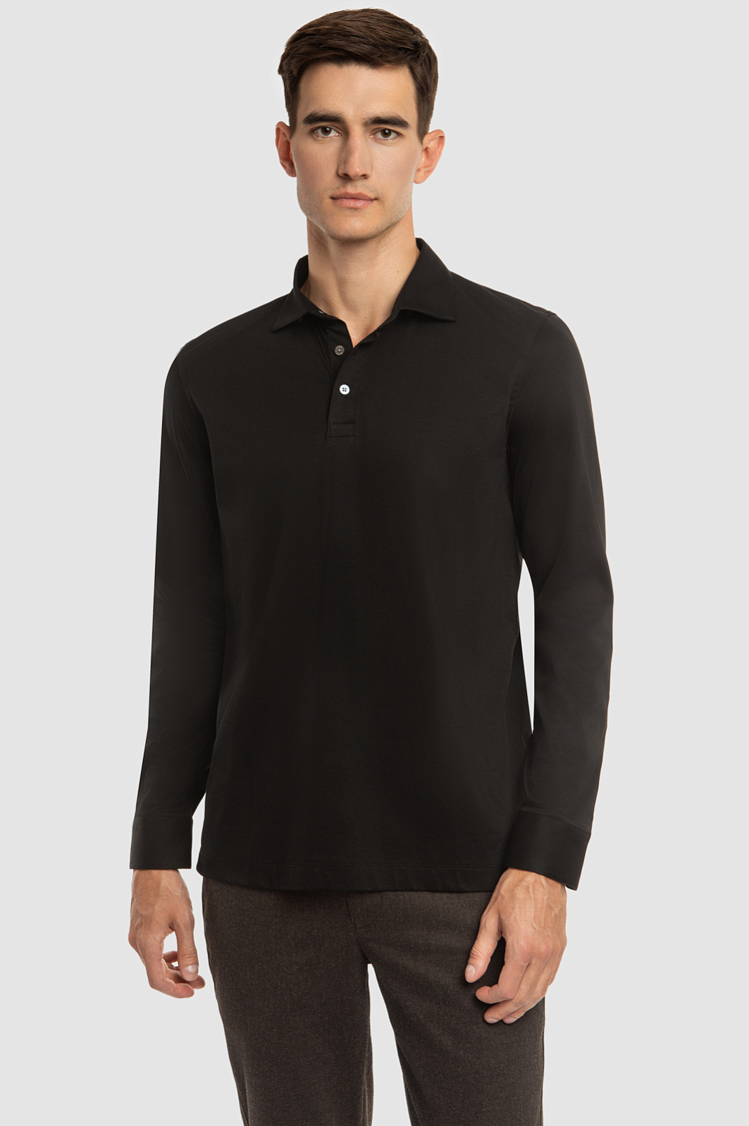 Практичное поло KANZLER на трех пуговицах с длинным рукавом выполнили из мягкого хлопкового трикотажа в универсальном черном цвете. Однотонное лаконичное поло прямого кроя без контрастных деталей легко впишется в повседневный мужской гардероб и станет основой для ваших образов как в стиле кежуал, так и в классических интерпретациях. Гладкий тонкий материал хорошо сохраняет тепло и при этом почти не ощущается на теле, обеспечивая комфорт на весь день. Наши стилисты рекомендуют сочетать его с брюками и пиджаком, завершив образ коричневыми высокими ботинками. Параметры модели: рост 192, 101-76-97 Размер на модели: M