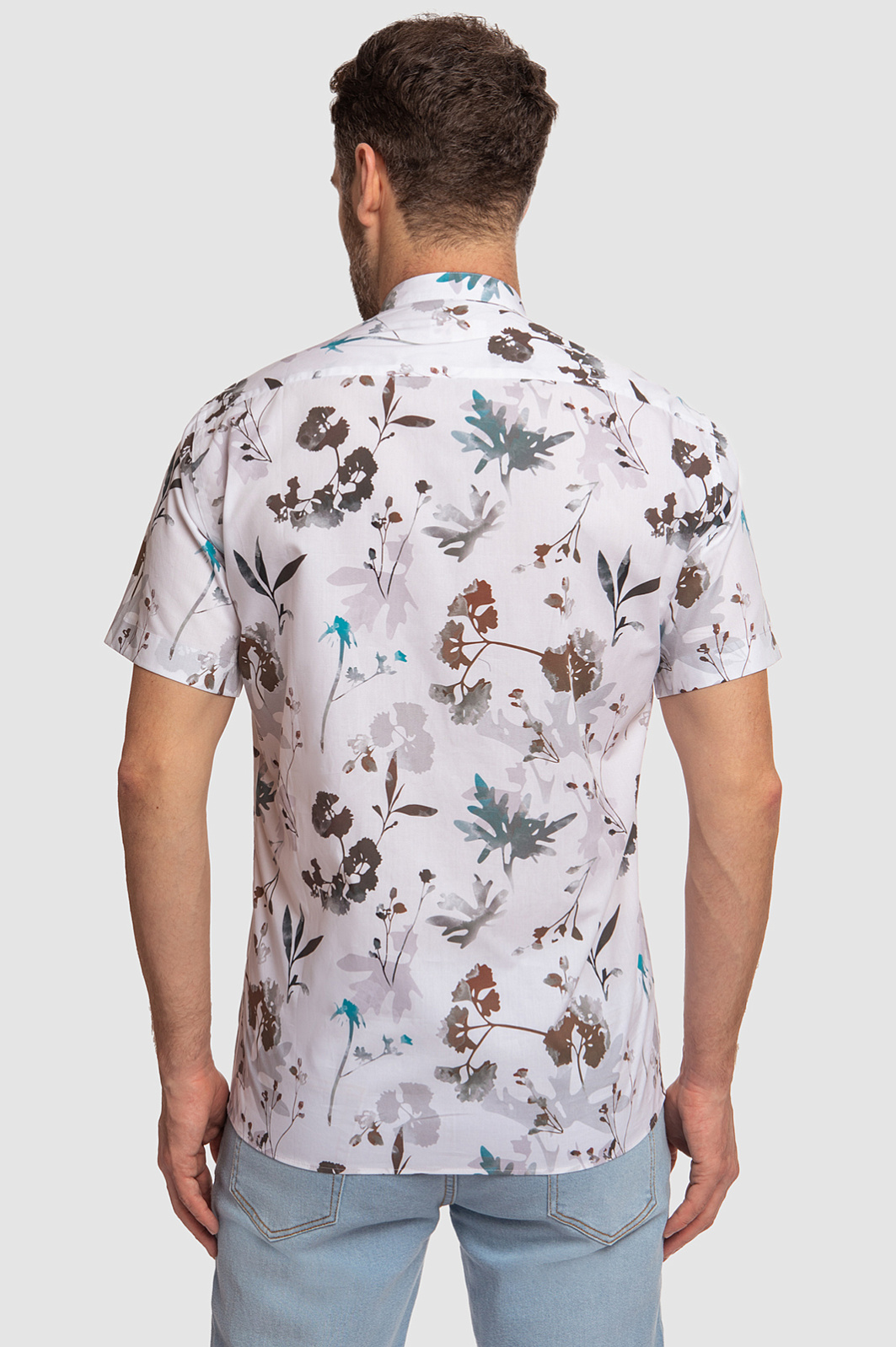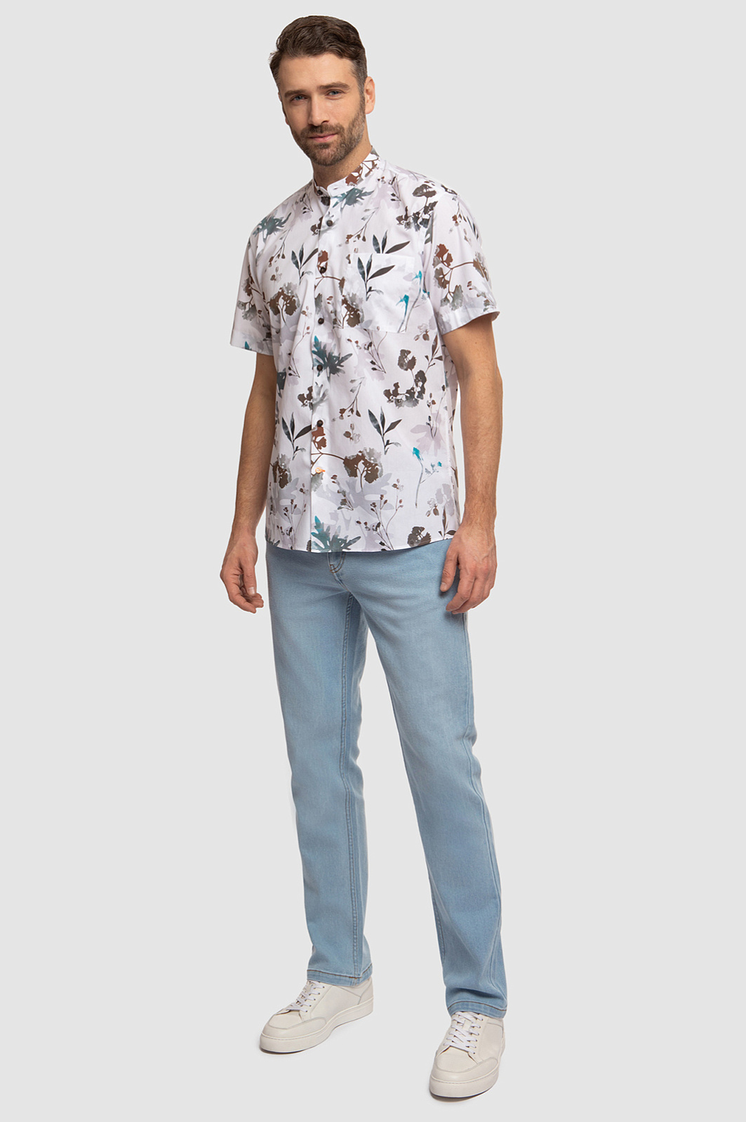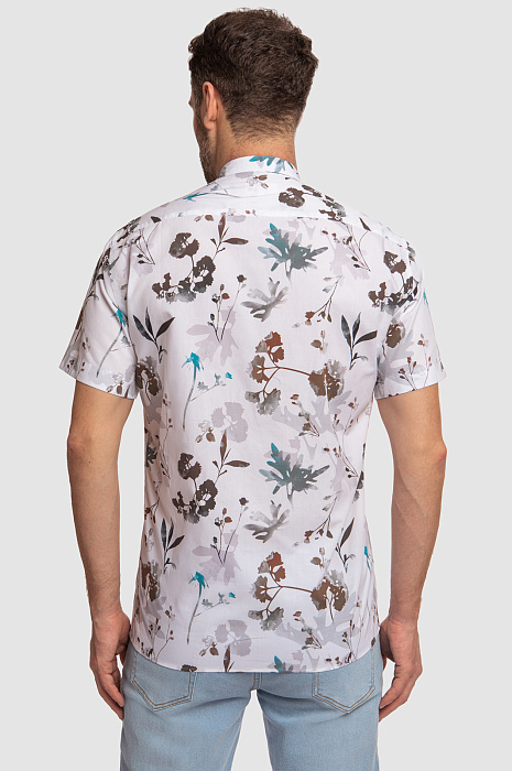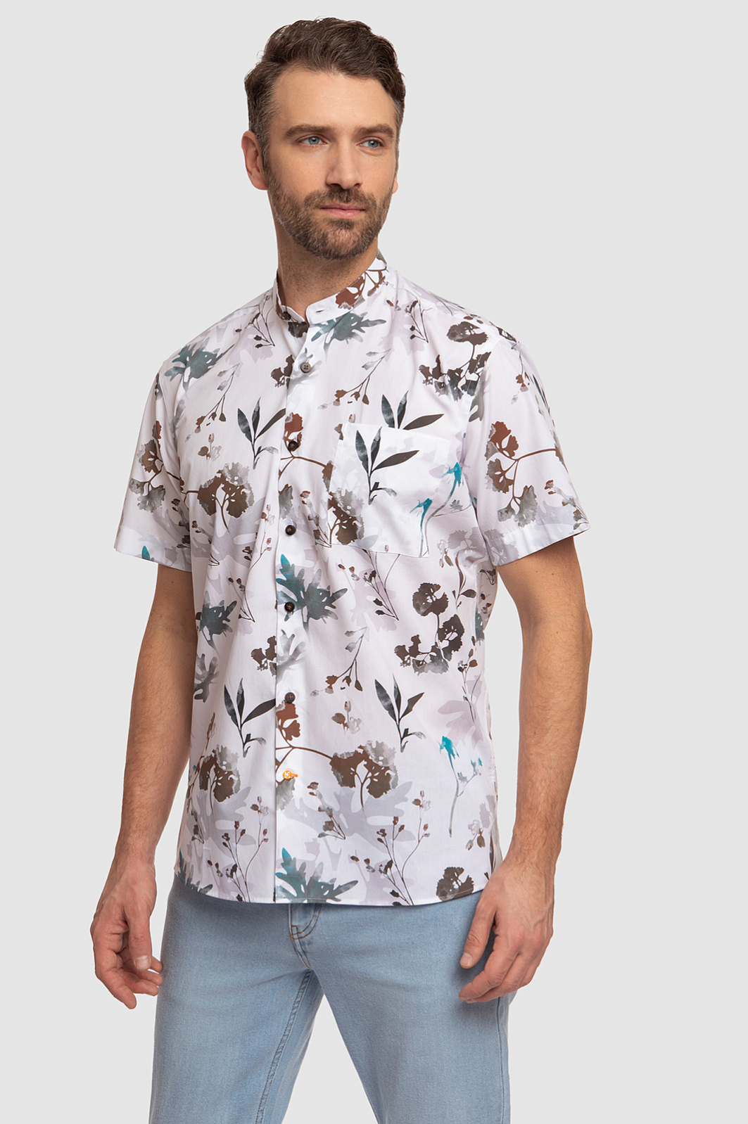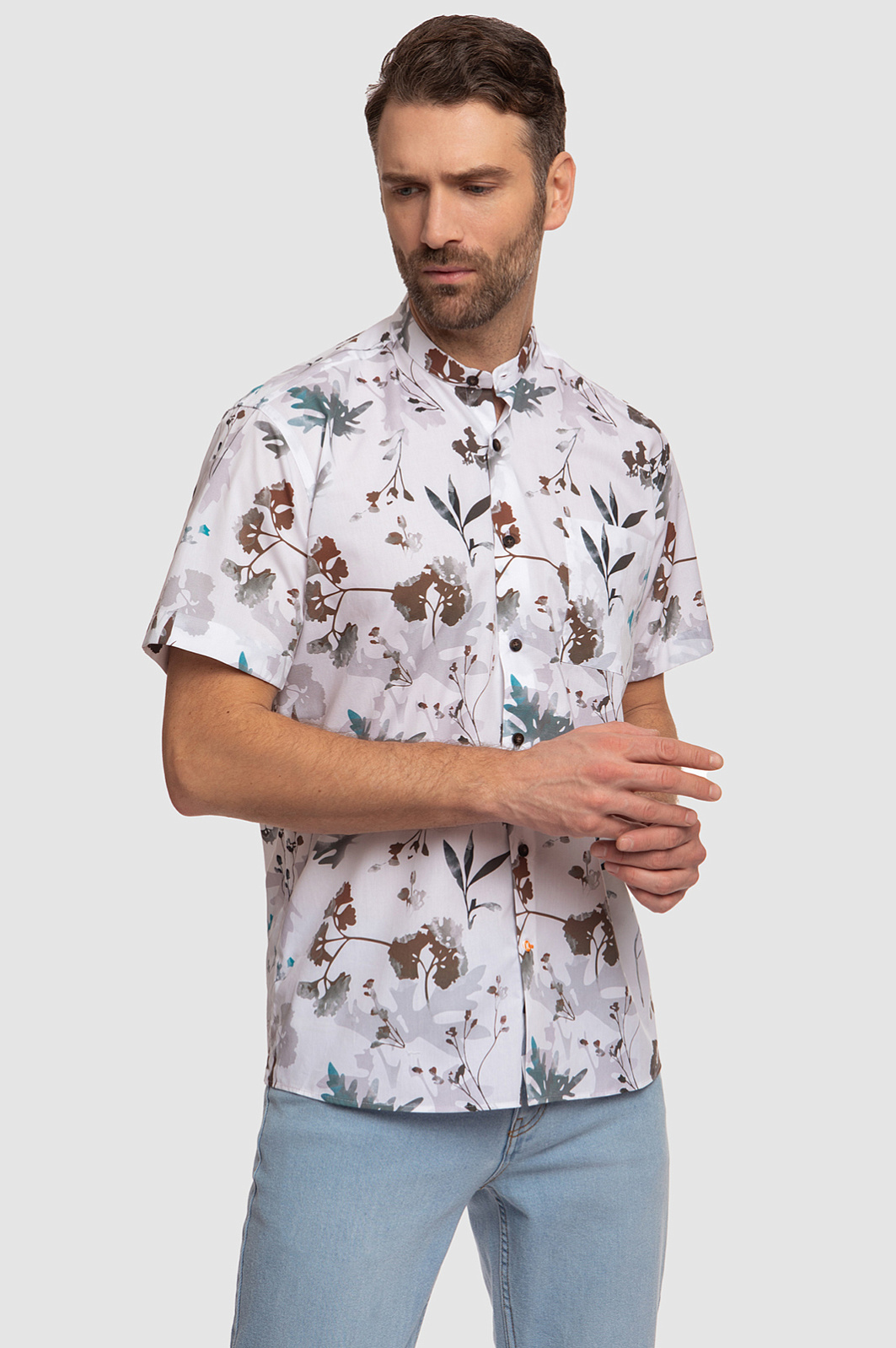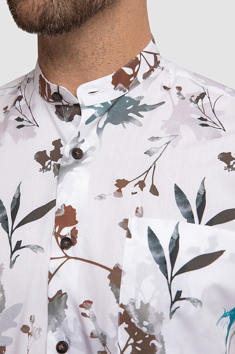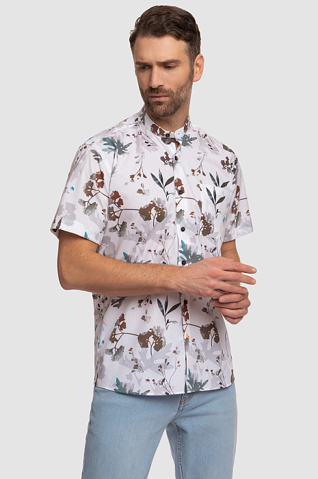 Стильная белая сорочка KANZLER с коротким рукавом и воротником-стойкой, украшенная зелено-коричневым растительным принтом, выглядит элегантно, но при этом непринужденно и неформально. Модель впишется в гардероб городского денди, который и на отдыхе не теряет лоска и шика. Растительный узор на ткани гармонично сочетается с джинсами и неформальными брюками в натуральной гамме. Свободный крой универсален — подойдет для всех типов фигур и любой степени активности. Гладкая ткань из чистого хлопка идеально подходит для теплого сезона: волокна хлопка берегут от зноя и прохлады, поддерживая оптимальную для тела температуру. Параметры модели: рост 189, 102-80-99 Размер на модели: 40