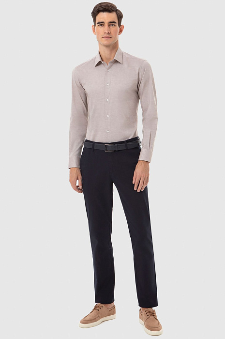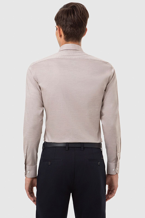 Сорочка - незаменимый элемент делового мужского стиля. Серо-бежевая сорочка с классическим воротником снизит градус формальности образа с деловым костюмом и сможет подружиться с кежуал брюками. Для пошива модели использовали тонкую ткань из отборного хлопка с шероховатой фактурой. Легкий дышащий материал сохранит свежий вид на весь день и обеспечит комфорт в течение дня. Наши стилисты предлагают дополнить пастельный оттенок изделия однотонными вещами: темно-синими брюками песочными топсайдерами. Параметры модели: рост 192, 101-76-97 Размер на модели: 40