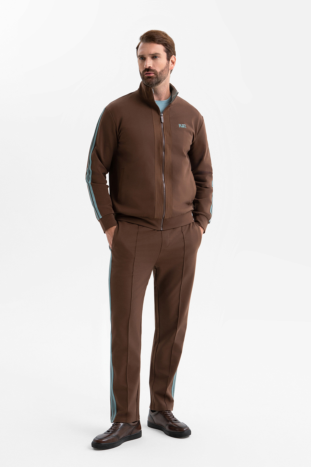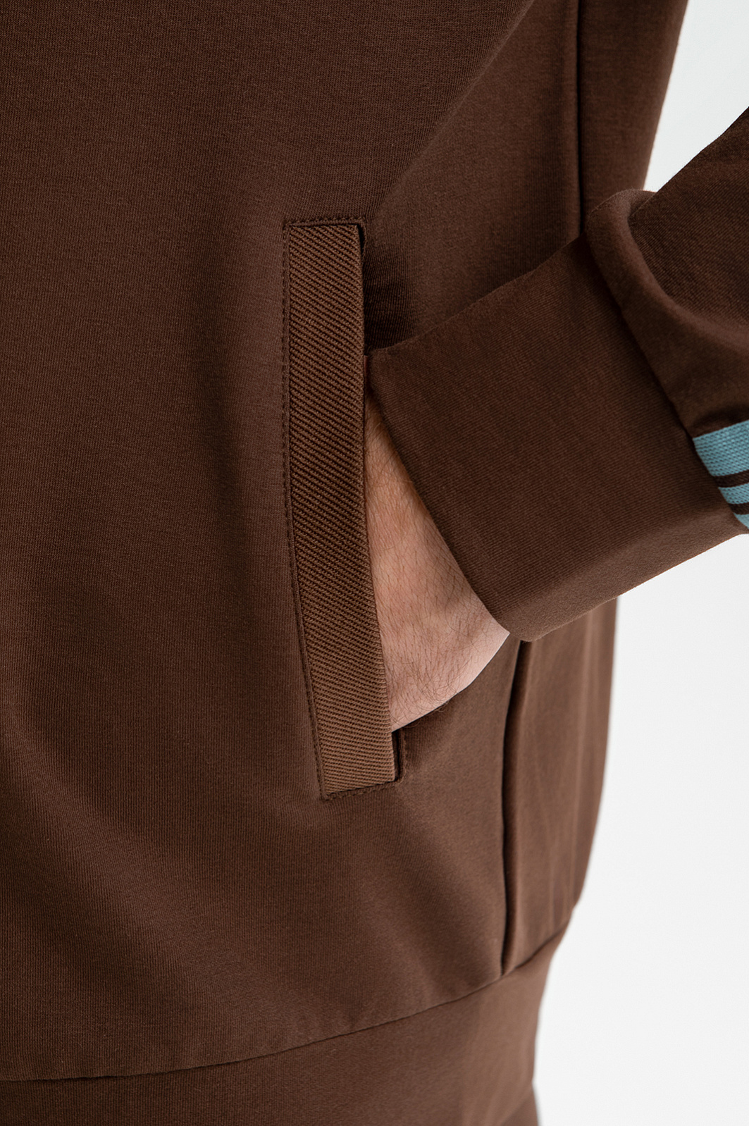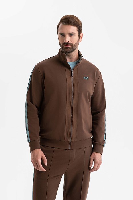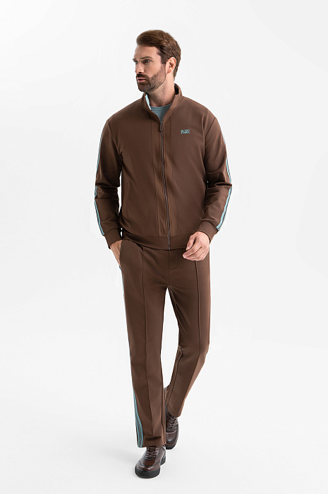Коричневый спортивный костюм KANZLER из хлопка с голубыми деталями отлично подойдёт для прогулок, путешествий и активного отдыха, сочетаясь с кроссовками или кедами. Контрастные вставки придают комплекту свежесть, создавая современный лаконичный образ. Костюм составлен из толстовки на молнии, украшенной фирменной вышивкой на груди, и джоггеров, которые можно регулировать с помощью шнурка на поясе. Застроченные стрелки спереди и лампасы по бокам задают вертикальные линии, которые делают силуэт стройным и подтянутым. Натуральный гипоаллергенный хлопок, на основе которого произведён трикотаж, можно носить весь день. Он хорошо пропускает воздух и приятен к телу, а добавление синтетических волокон помогает ему держать форму и сохранять безупречный вид.