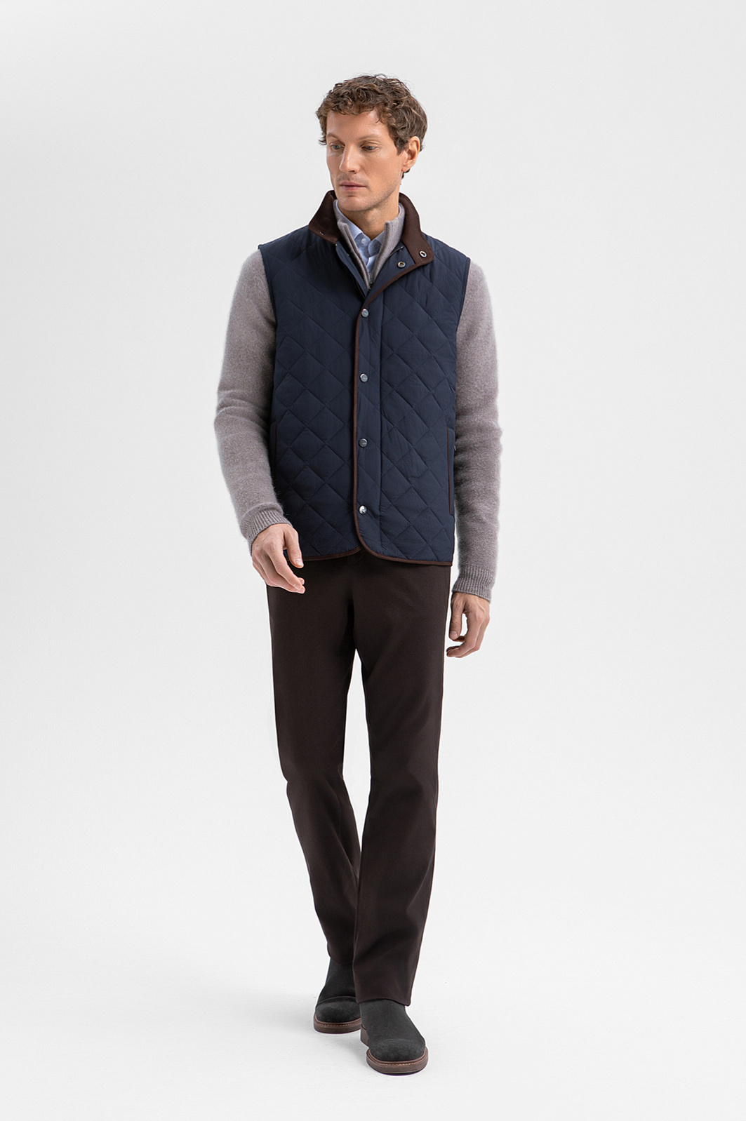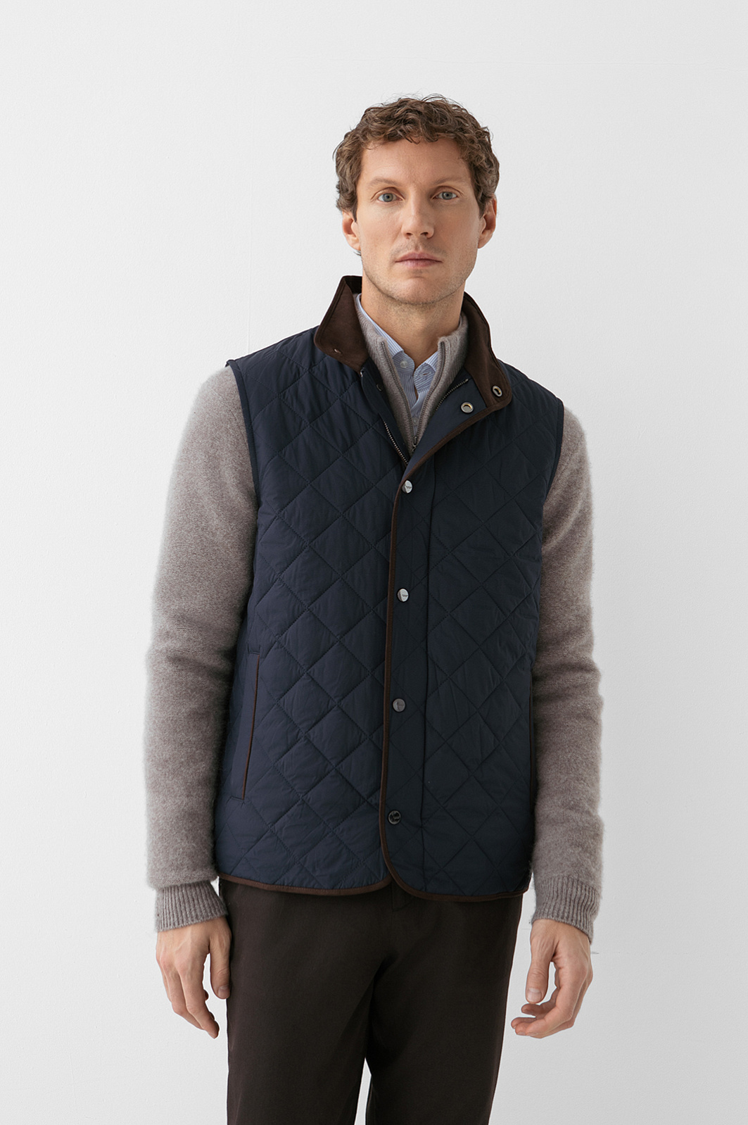 Стёганый жилет KANZLER в глубокого синего оттенке с коричневой отделкой — лёгкий способ утеплиться в прохладные дни и холодное межсезонье. Ромбовидный узор отсылает к классике английского стиля. Коричневый подборт добавляет образу теплоту и благородство. Широкая планка, прикрывающая молнию, и воротник-стойка служат надежным барьером от ветра. Водоотталкивающая обработка делает жилет неуязвимым для дождя. Внешний слой, подкладка и внутренний наполнитель сделаны из полиэстера — надежного и прочного синтетического материала, который прослужит долго, сохраняя свои защитный качества и аккуратный внешний вид.