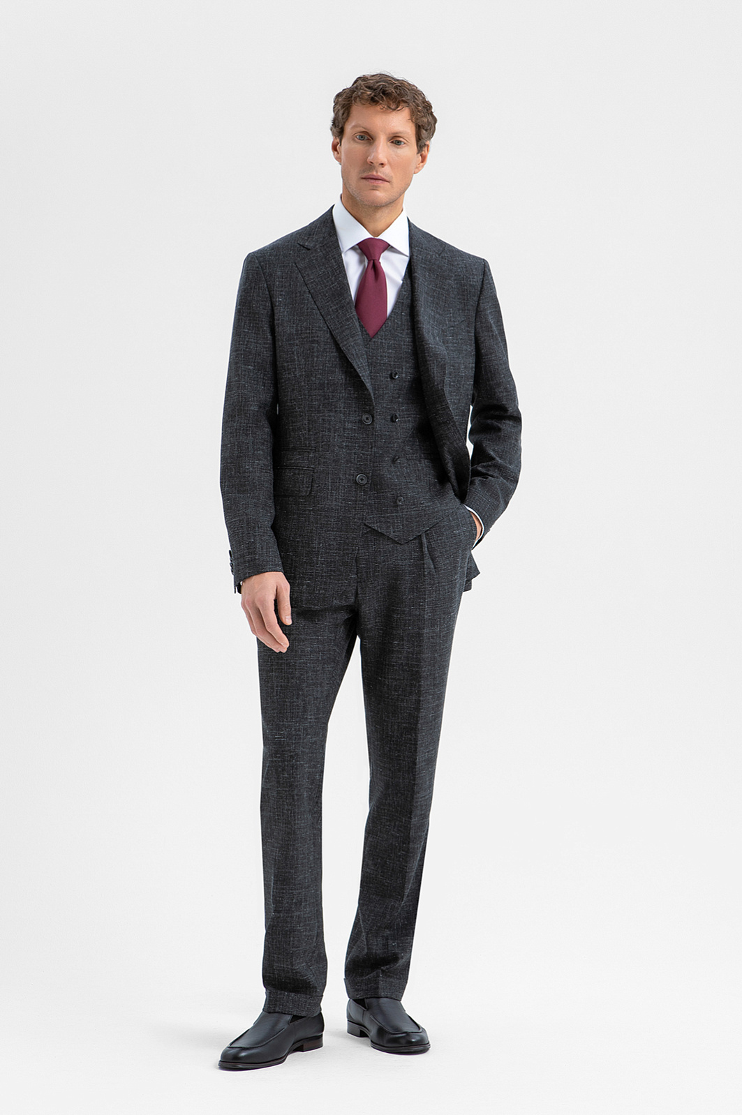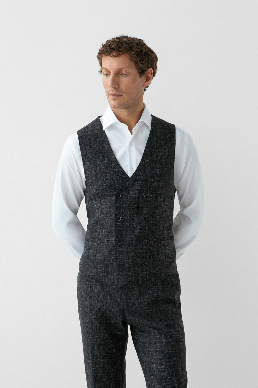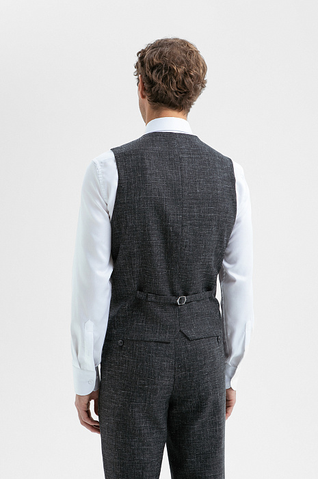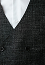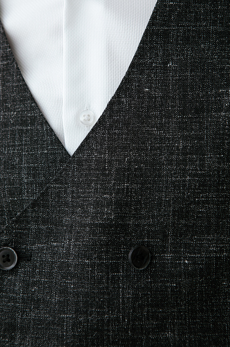 Роскошный чёрный двубортный жилет KANZLER из шерсти мериноса, льна и шёлка превращает двойку в тройку — самый элегантный вариант мужского костюма. Умеренно зауженный крой подчёркивает линии тела и не утяжеляет силуэт костюма-тройки. Модель может выступать самостоятельным акцентом образа, дополняя сорочку и брюки в неофициальной обстановке. Дорогая смесовая ткань на основе шерсти мериноса и льна с добавлением шёлка объединяет лучшие свойства натуральных гипоаллергенных волокон. Мягкие волокна мериносовой шерсти не раздражают даже самую чувствительную кожу, лён обеспечивает прочность и текстурность, а шёлк придаёт материалу нежность и благородный лоск.